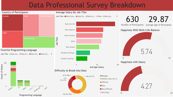 28th November 2022 Survey Breakdown for Data Pros Visualization of a survey conducted on Data Science Professionals and their overall happiness with their Jobs!