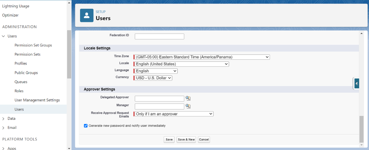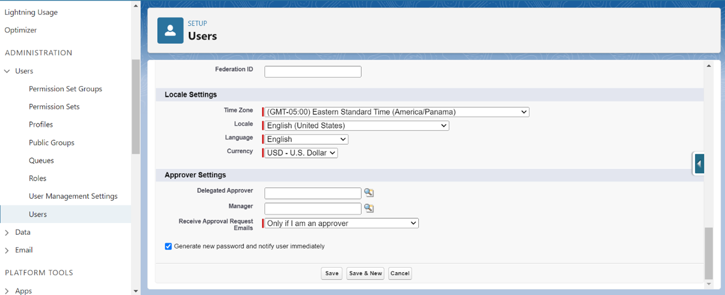 5. Scroll to complete Mailing Address, Single Sign on Information, Locale settings and Approver Settings.