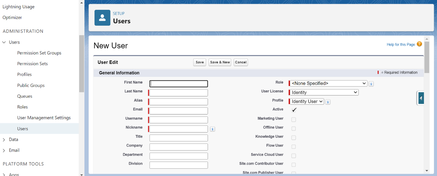 4. Click New User and fill out General Information. All fields marked with red are mandatory. Be sure to click in User License and select the correct license for the specified role of the user in the organization.